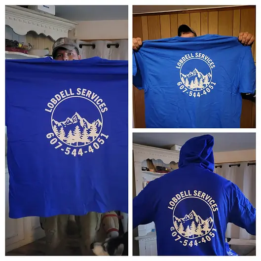 Personalized clothing options with your choice of sizes and colors, showcasing Lobdell Services branding. Prices starting at $25.00 for tee shirts prices may vary based on sizes Shipping available